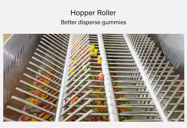 Kinds of device by newly design such as the Hopper Rollers, in order to better disperse gummies; Special Sliding Piece device Prevent gummies are no sticky together; Cellular Structure Channel of SUS 316 could Fully disperse gummies. Highly bottling gummy precision of 16H, with the independent scanning infrared system module, packing bottling gummies oiled accuracy rate far exceeding the field standard is more than 99.98%.