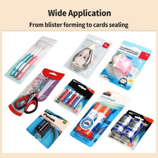 Suitable for packaging small hardware (screws, nuts, bolts), stationery (pins, staples), and daily necessities (cosmetic sponges, small tools). The machine’s customizable molds allow for the packaging of irregularly shaped products, while the tight blister-card seal prevents loss or scattering of small items, improving packaging efficiency and product presentation.
