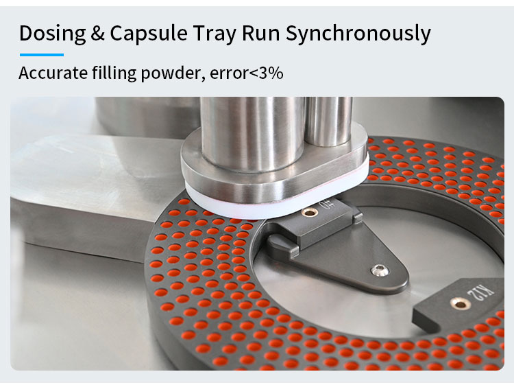 In the old type of semi automatic Capsule Filling Machine, after a long time of operation of the tray, the powder will leave residues in the dosage plate and bearing, that greatly affects the stability of operation. With comparison, we integrate the new clean tech with the tray. At the end of the whole filling capsules process, the next working position is equipped with a large suction air system. After the machine completes a whole of capsules fill production process, it must pass through the cleaning port. The capsule plate part will absorb the residual powder and capsule shell through the exhaust high-pressure system to ensure the smooth and stable operating of the next time.