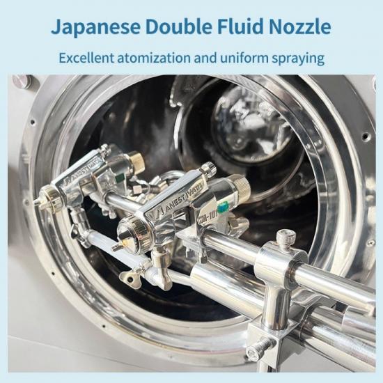 Achieving uniform coating requires better and more even spraying. Our machine is equipped with high-quality dual-fluid nozzles from Japan, renowned for their exceptional atomization performance. These nozzles combine compressed air and liquid flow to produce a fine, uniform mist with the following characteristics: